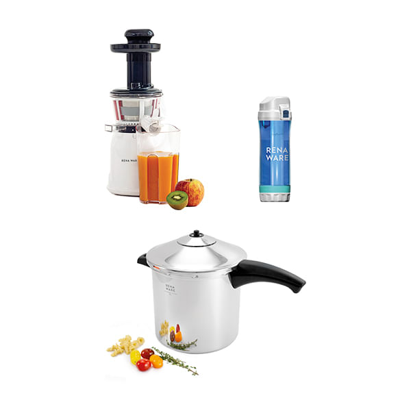 Este especial incluye Extractor de Jugo Nutrex Press™ + Olla a Presión 8 L+ Botella Filtrante Rena Ware: