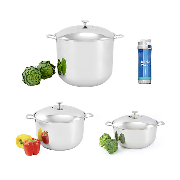 Este especial incluye Max Cooker 27 L + Super Deluxe Cooker 16 L + King Cooker 12 L + Botella Filtrante Rena Ware: