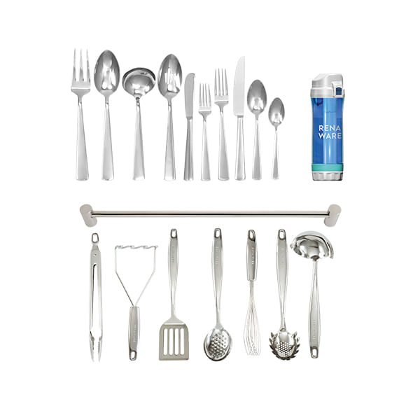 Llévate 2 juegos de Cubiertos Élite 35 piezas c/u + Juego de Útiles de Cocina 8 piezas + Botella Filtrante Rena Ware.